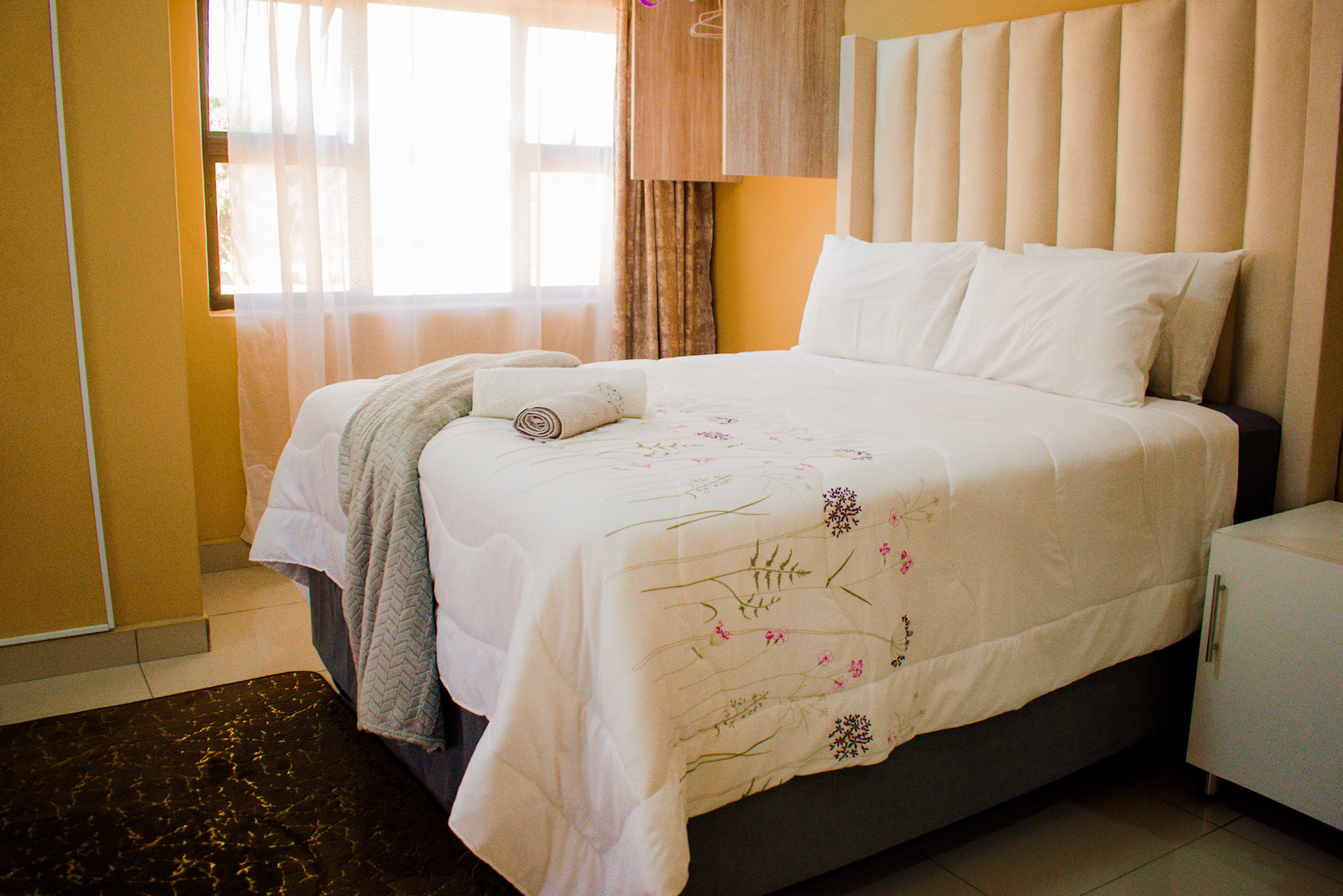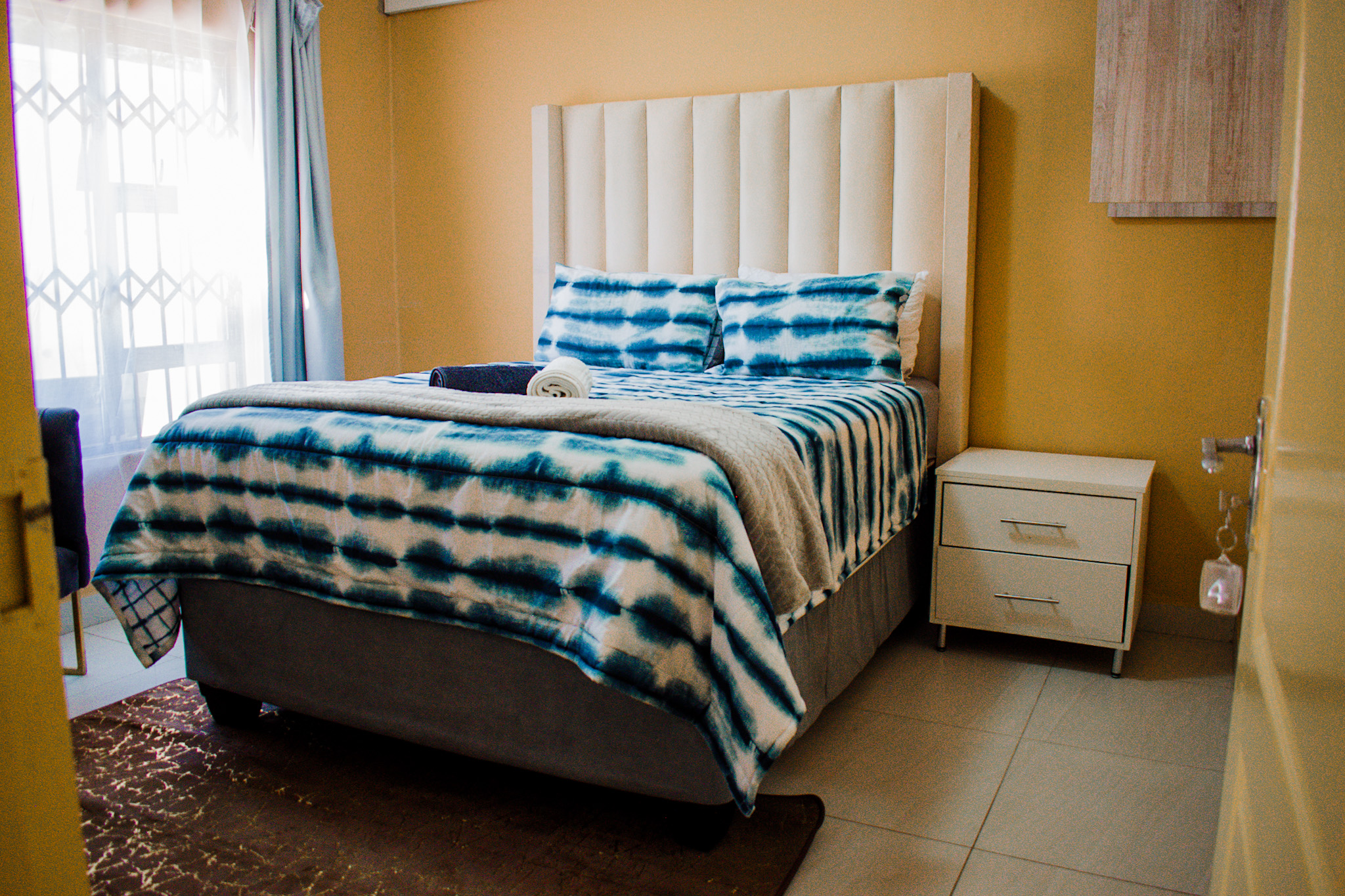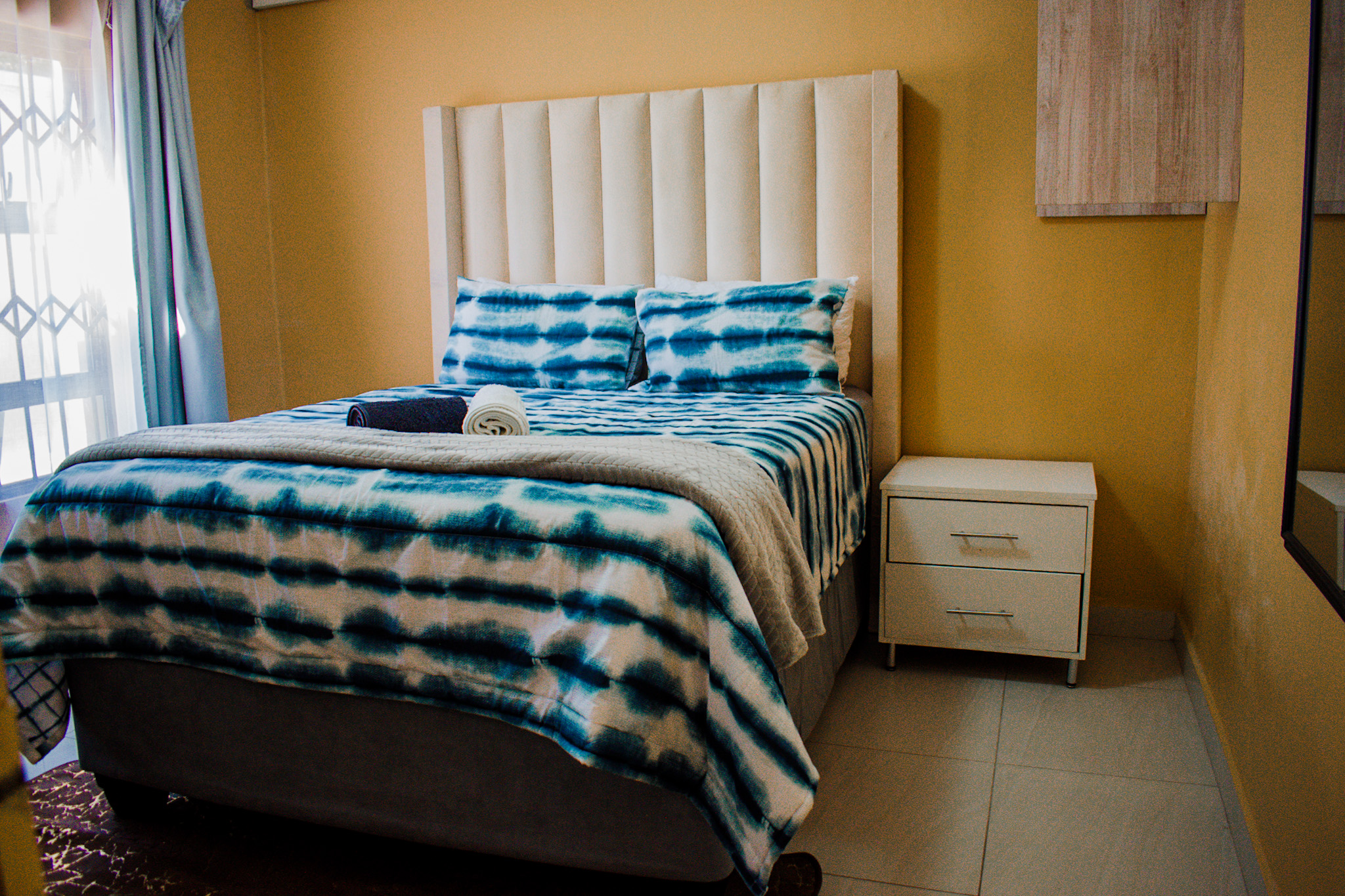 Welcome to the second room at our guest house, where comfort and practicality blend seamlessly. You'll find a serene space adorned with a plush twin or full-sized bed dressed in luxurious linens, ensuring a restful night's sleep. Ample storage solutions including a wardrobe and under-bed compartments allow for effortless organization of your belongings.